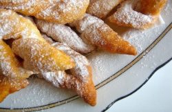 A hozzávalókból levestészta állagú tésztát gyúrok, majd tenyérnyi téglalapokat vágok belőlük. Mindegyik téglalapot bevágom középen hosszában, és a szélső tésztadarabokat a nyílásokon áthúzom. Így kissé amorf alakzatokat kapok. Bő olajban pirosra sütöm mindegyiket, óvatosan, oda ne égjenek, mert erre sajnos hajlamosak. Porcukorral megszórva, esetleg baracklekvárral tálalom.