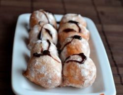 Az átlagosnál jobban ragad a tészta, de ez nem baj. Kb. ujjnyi vastag téglalappá nyomkodjuk, és egy lisztezett késsel négyzeteket vágunk belőle. Nem túl nagyokat, hozzávetőleg 5×5 centiseket. A fánknál szokásos módon, kb. 160 fokos olajban szép pirosra sütjük. Törlőpapírral bélelt tálra szedjük, és tálalás előtt bőven megszórjuk porcukorral.
