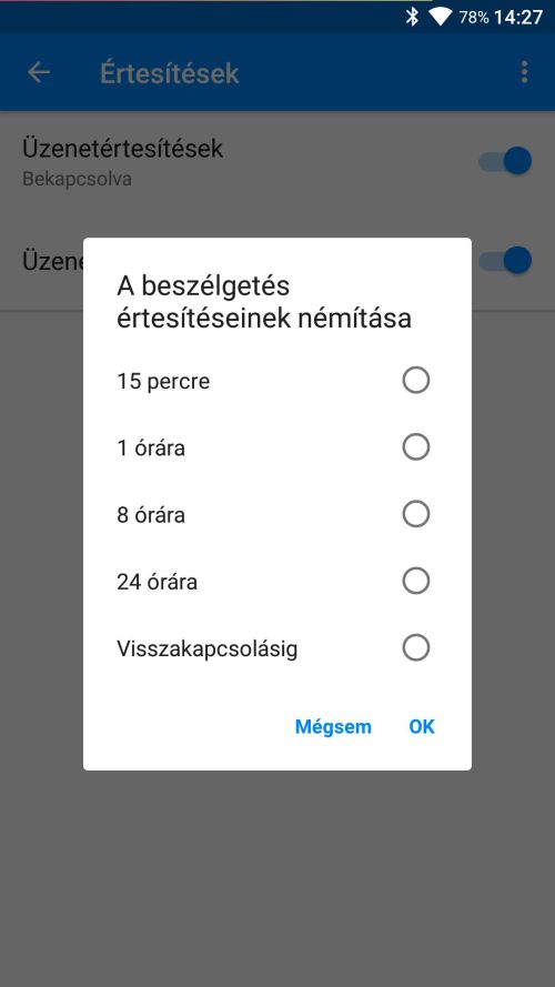 Lépjünk be az előző pontban említett „Részletek” opcióba, kicsit lejjebb válasszuk az „Értesítések” menüpontot. Ezt megérintve eldönthetjük, mennyi időre kapcsoljuk ki az illetőt: 15 percre, 1, 8, 24 órára, vagy hallgasson el egészen visszakapcsolásig.