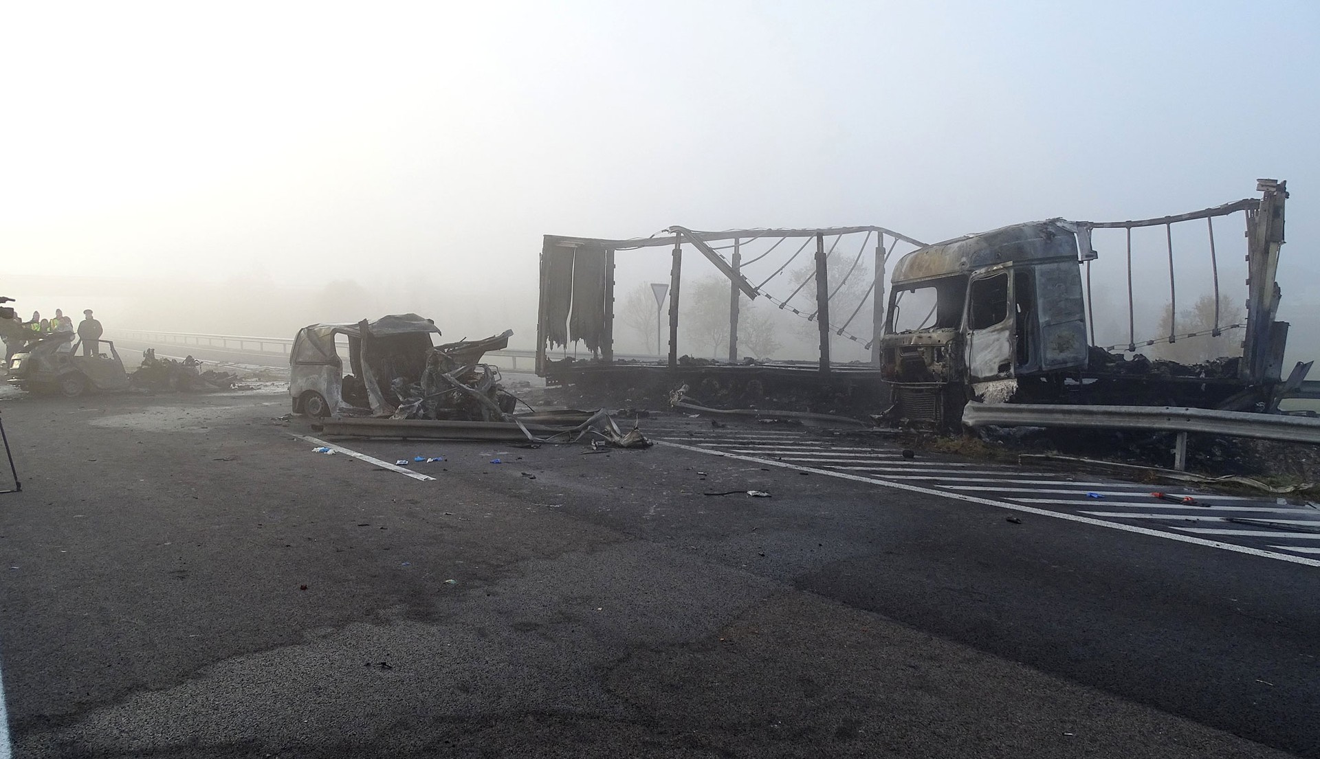 Döbbenetes képet festenek le az M5-ösön hétfőn hajnalban történt baleset helyszínén készült fotók. A kamion és a két másik jármű porig égett, hét ember halt meg.