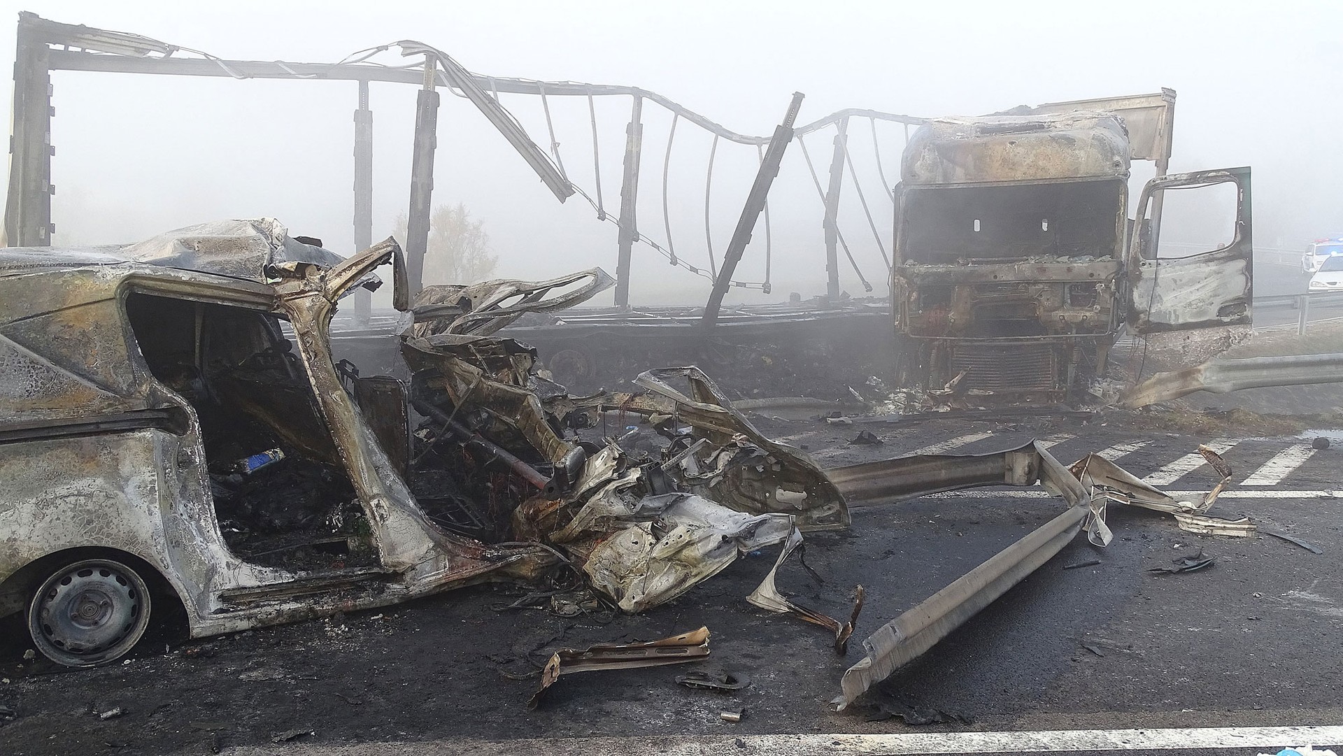 Ütközésben összetört, kiégett járművek az M5-ös autópályán Kistelek közelében, a 146-os kilométerszelvényében 2019. október 28-án / Fotó: MTI/Donka Ferenc