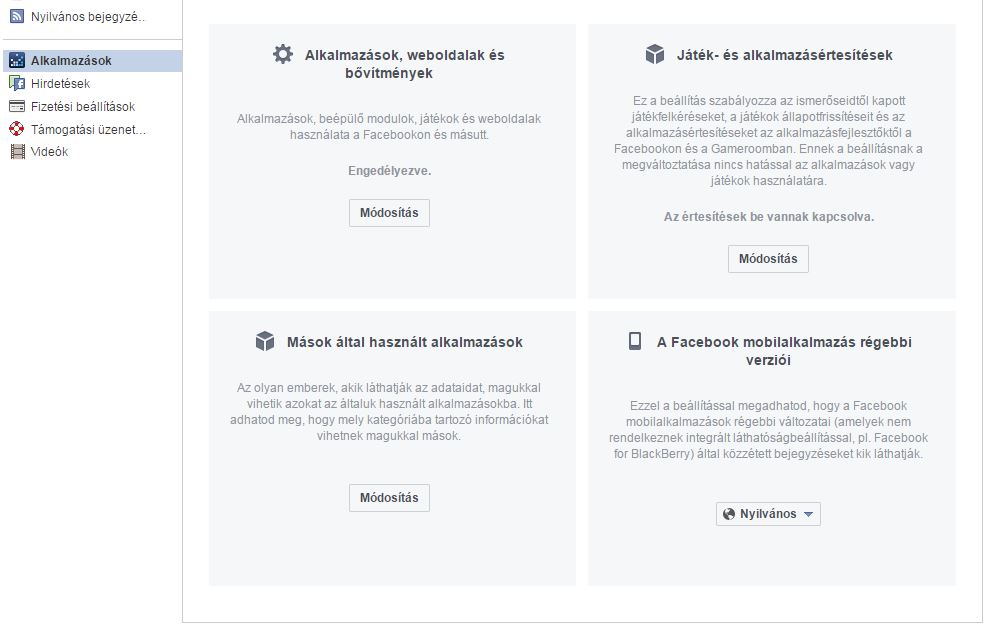 Ha nem akarod, hogy az alkalmazások és weboldalak hozzáférjenek más információkategóriákhoz (például az ismerőseid listája, a nemed vagy a nyilvánossá tett adataid), kikapcsolhatod a platform összes alkalmazását. De ne felejtsd el, hogy te sem fogsz tudni használni egyetlen játékot vagy alkalmazást sem.)