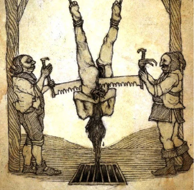 A halálra ítéltet fejjel lefelé fellógatták, széttárt lábakkal, majd elkezdték hosszában fűrészelni. Persze nem valami gyors láncfűrésszel, ami másodpercek alatt végez vele, hiszen akkor még nem volt ilyen eszköz. Kételkedem benne, hogy használták volna, ha lett volna. Elvégre a sima egyszerű lefejezést évezredek óta alkalmazták, mégsem tették a különféle kegyetlen és brutális kivégzési módok helyett, az nem volt elég véres, nem szenvedett eleget az illető. De itt! Mivel a vér (ami nem távozott a vágás nyomán) a fejébe tolult, zavarba ejtően sokáig eszméleténél maradt a szerencsétlen: általában csak akkor szenderült jobblétre, amikor a fűrész már a mellkasánál járt.