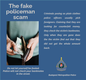 Egy külföldi házaspártól kért útbaigazítást egy férfi 2021. szeptember 24-én délelőtt Budapest VII. kerületében. Közben odalépett hozzájuk még valaki, aki valamilyen igazolványt felvillantva rendőrnek mondta magát. Angolul beszélve, illetve mutogatással mindhármuktól elkérte a náluk lévő pénzt, hogy ellenőrizze, nem hamis-e. A házaspár csak hotelszobájukba visszatérve vette észre, hogy az átadott 200 ezer forintból csak 66 ezret kaptak vissza.