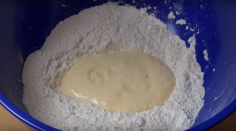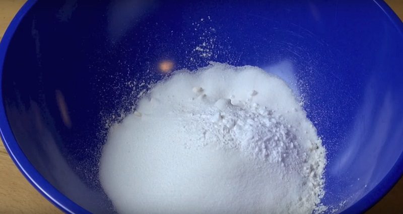 Keverjük össze a lisztet, a porcukorral a szódabikarbónával és a sütőporral.