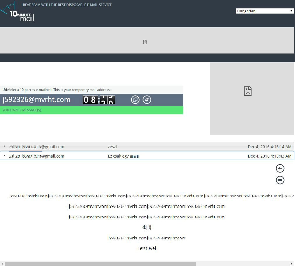 Balra láthatjuk az éppen generált átmeneti e-mail címünket, s a visszaszámlálás indul is. A számlálótól jobbra található ikonra kattintva kimásolhatjuk a kissé nehézkes e-mail címet, mellette pedig akár újabb 10 percet igényelhetünk.