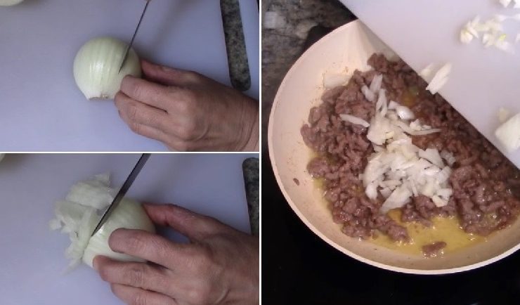 Tegyük a darált húst forró olajba egy serpenyőbe, az apróra vágott hagymát adjuk hozzá.