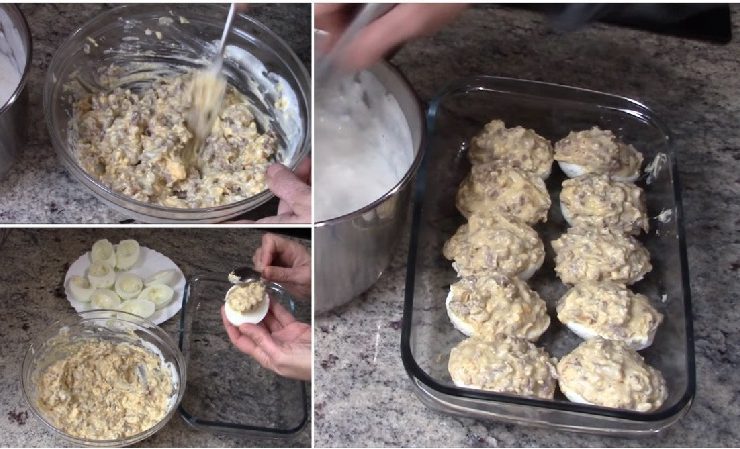 Keverjük össze egy tálban a darált húst, az összetört tojássárgájával, majd öntsük rá az elkészített besamelmártás felét és kavarjuk jól össze. Töltsük meg a tojásokat az elkészített darált hússal és tegyük egy hőálló tálba.