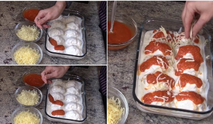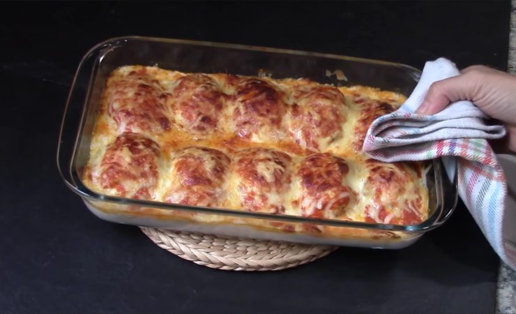Öntsük rá a megmaradt besamelmártást, kanalazzuk rá a sűrített paradicsomot és szórjuk rá a reszelt sajtot. Süssük a tojásokat 180 fokos sütőben nagyjából 10 percig.