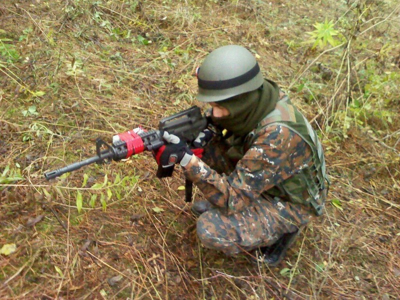Csaba szívéhez a tankok mellett az airsoftfegyverek is közel állnak, büszkén pózol velük terepmintás ruhában.