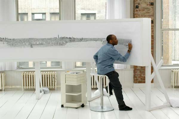 Aprólékos részletekkel kidolgozott városképei lenyűgözőek. A közel 6 méter széles vászonra rajzolt New York grafikát is egy 20 perces helikopteres út után alkotta meg.