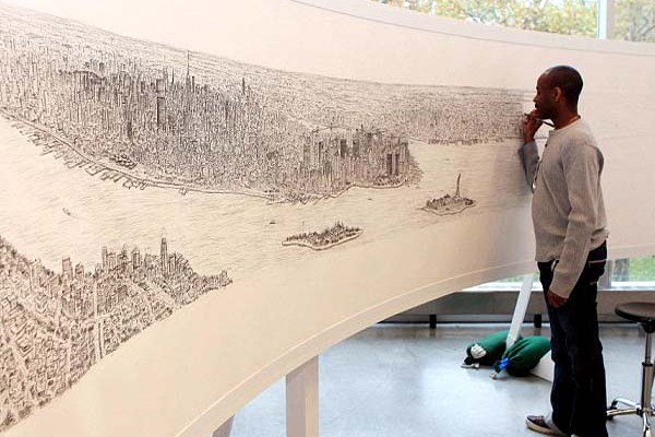 Aprólékos részletekkel kidolgozott városképei lenyűgözőek. A közel 6 méter széles vászonra rajzolt New York grafikát is egy 20 perces helikopteres út után alkotta meg.