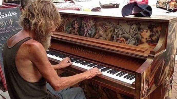 Most kapóra jött neki, hogy egy jó szándékú hangszerbolt-tulajdonos kitett egy zongorát a boltja elé. A zongorán bárki játszhat, aki csak kedvet kap hozzá!