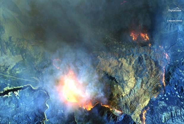 A DigitalGlobe műholdjával készített infravörös rövidhullámú felvétel a kaliforniai Paradise-ban tomboló erdőtűzről 2018. november 9-én.