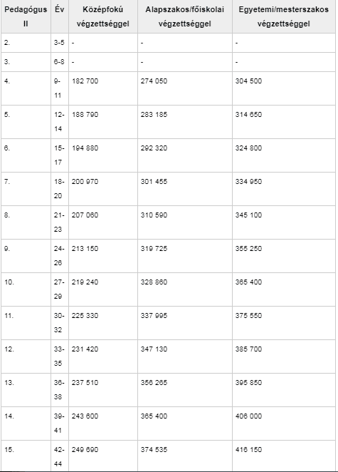 Bruttó fizetések 2017 szeptemberétől a pedagógus II fokozatban