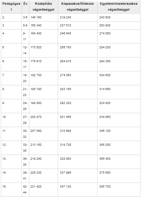 Bruttó fizetések 2017 szeptemberétől a pedagógus I fokozatban
