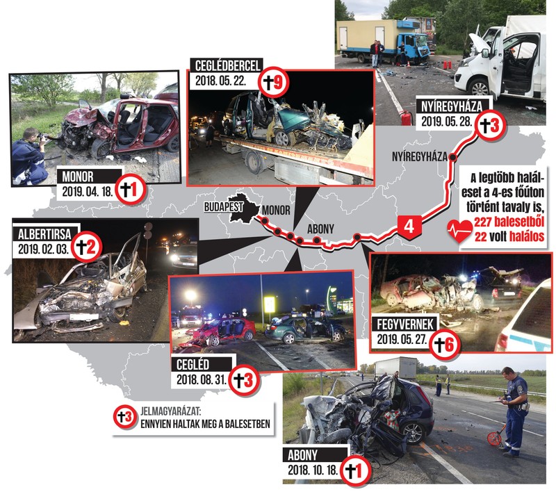 A 4-es számú főúton 227 balesetet regisztráltak 2018-ban, ezek közül összesen 22 volt halálos kimenetelű. Érdekes adat, hogy a kutatások szerint 0,64 kilométerenként történik egy-egy baleset. A felmérés szerint a 4-es út után az M3-as és az M1-es autópálya a legveszélyesebb.