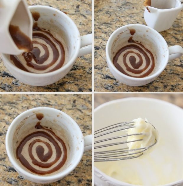 3. Egy mikróbiztos csésze aljára tegyél 3 evőkanál tésztát, majd csorgasd rá a fahéjas öntet felét, csiga vonalban. Gyorsan kell dolgoznod, mert hamar megdermed a vaj. Majd kanalazd rá a maradék tésztát és újabb fahéjas öntet következik.