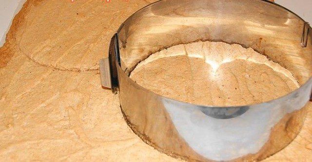 A megsült tortalapból két tortaformát szaggatunk, cukrászgyűrűvel. Én két darab 20 cm átmérőjű tortalapot kaptam a megmaradt darabokkal a tortát díszítettem.