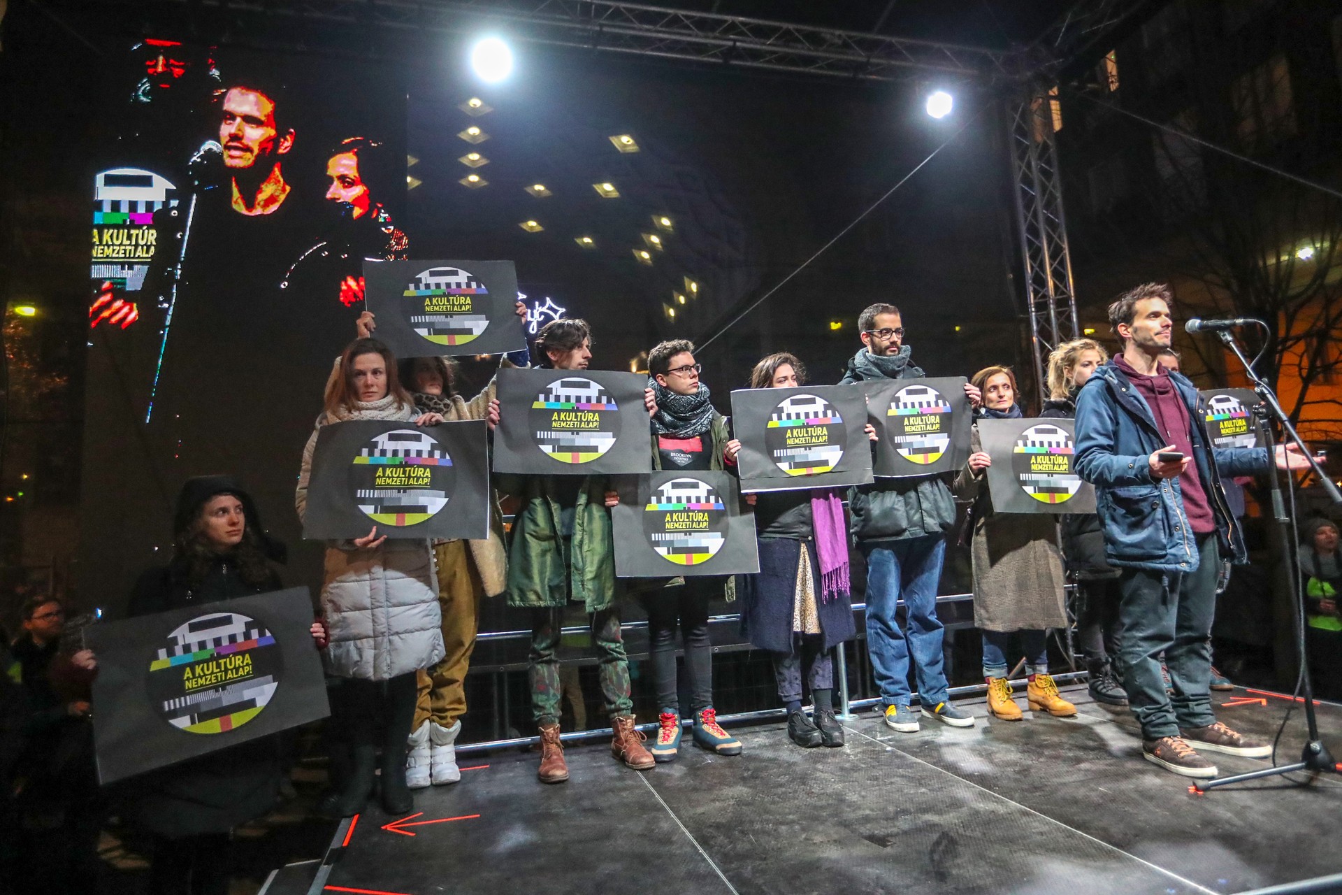 Elsőként Sodró Eliza lépett színpadra, ahol pontosan 111, 30 éven aluli színész közös nyilatkozatát olvasta fel az eseményen, melyben a kormányhoz is szólt: