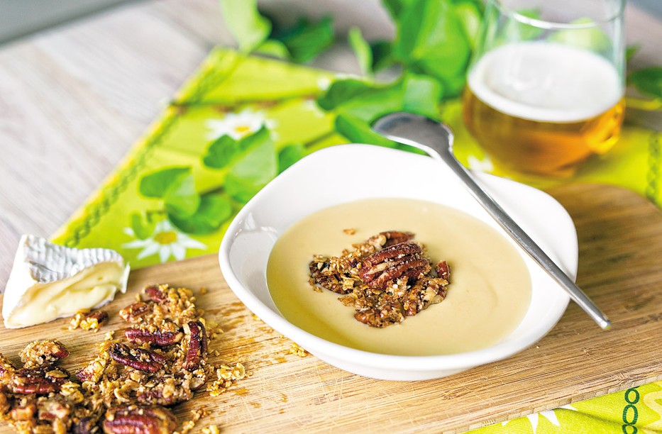 4. A cheddart lereszeljük, a brie-t kockára vágjuk, a levesbe szórjuk és további 5 percig főzzük. A még meleg morzsával tálaljuk.