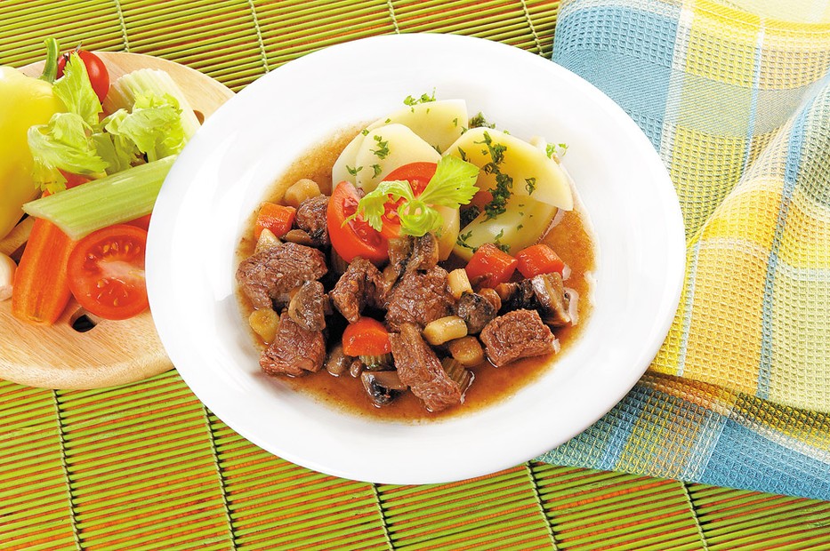 4. Tálaláskor tányérra tesszük a sörös, zöldséges, húsos ragut, és a petrezselymes burgonyával kínáljuk.
