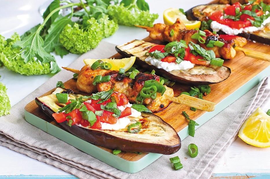 4. A húsdarabokat nyársakra húzzuk, grillen megsütjük, közben forgatjuk és a maradék páccal kenegetjük. A padlizsánszeleteket is meggrillezzük, majd egymás mellé tesszük, meglocsoljuk az oregánós olajjal, rákanalazzuk a ricottát és a paradicsomot. Megszórjuk a zöldhagymával és a petrezselyemmel. A csirkenyársakkal, és 1-1 citromgerezddel frissen tálaljuk.