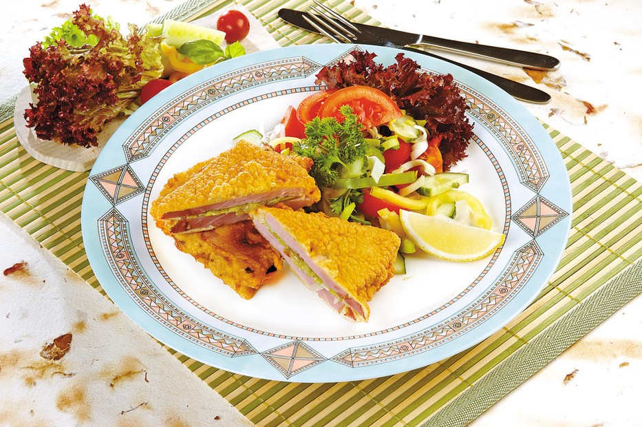 3. A sörtésztához a tojások fehérjét kemény habbá verjük. A sárgáját elkeverjük egy csipet sóval, a liszttel, a sörrel, majd a habbal lazítjuk. A töltött sonkaszeleteket lisztbe forgatjuk, majd a tojásmasszába, és bő, forró olajban kisütjük. Sütés után konyhai papírtörlőre szedjük, hogy felszívja a felesleges olajat. A salátával frissen tálaljuk.