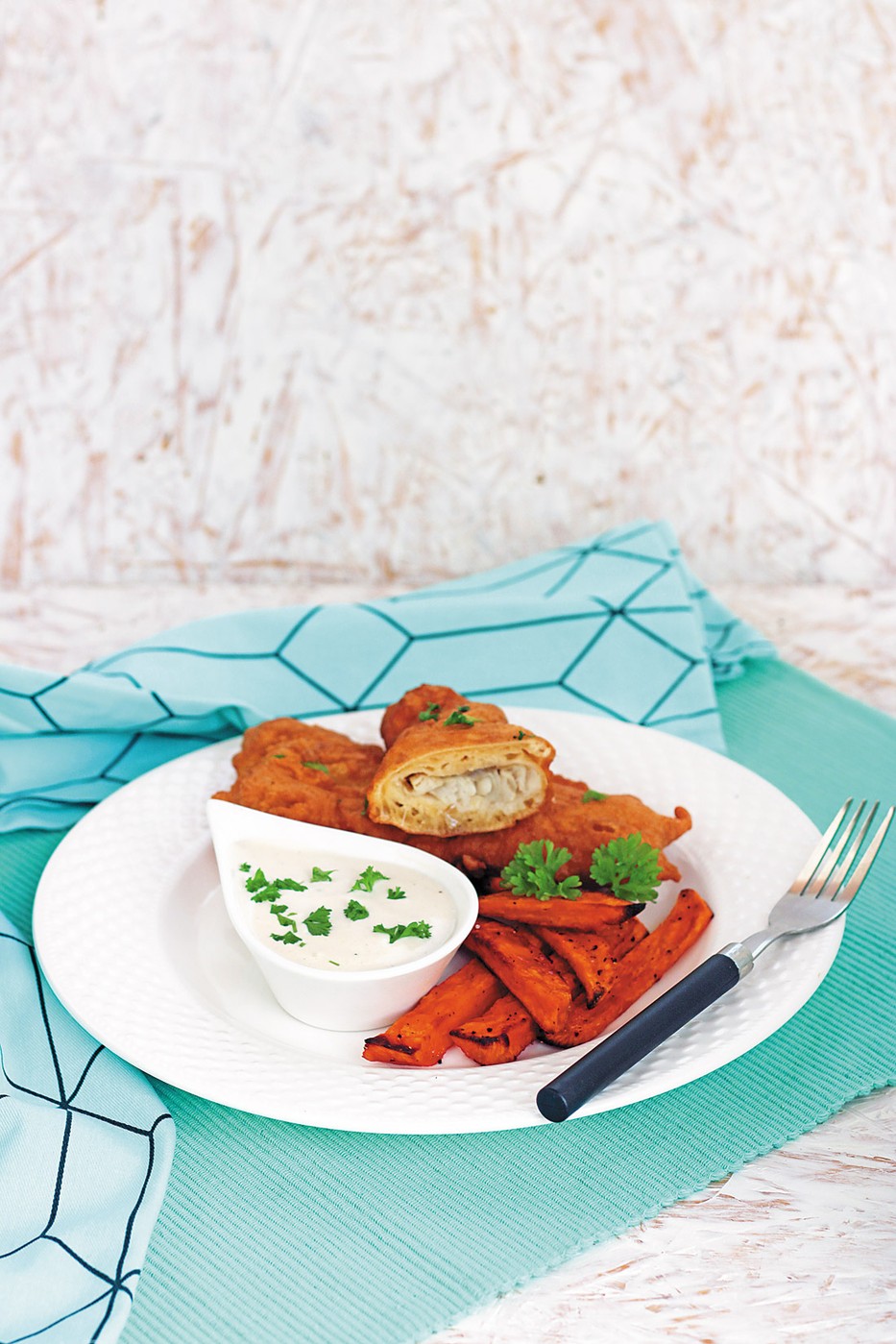 3. A halat felszeleteljük, megmossuk, a nedvességet jó alaposan felitatjuk róla, majd sózzuk, borsozzuk. Először a keményítőbe forgatjuk, majd a sörös masszát jó alaposan rákenjük, a forró olajban aranybarnára sütjük. A sült édesburgonyával és a majonézzel azonnal tálaljuk.