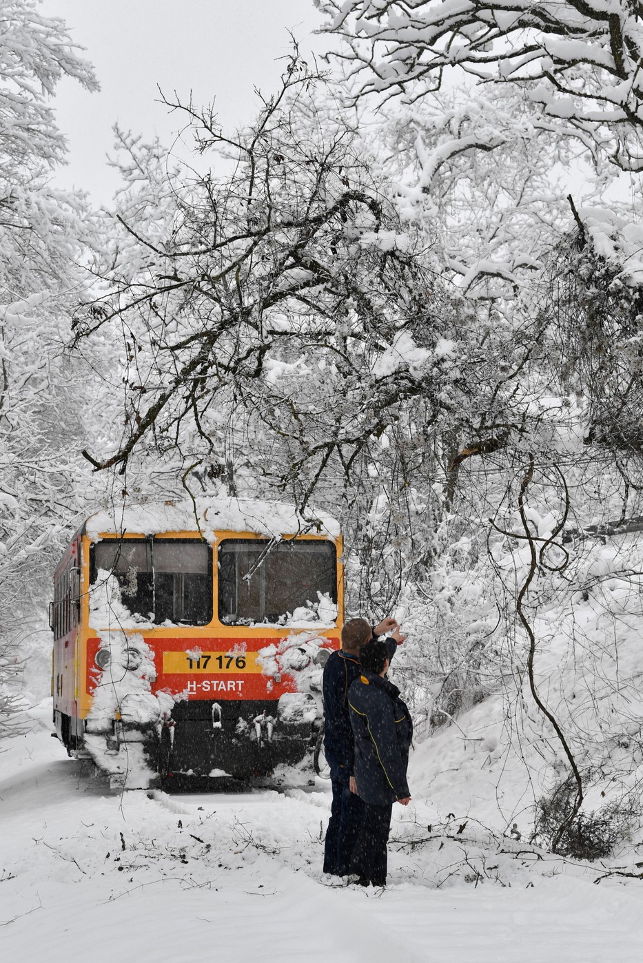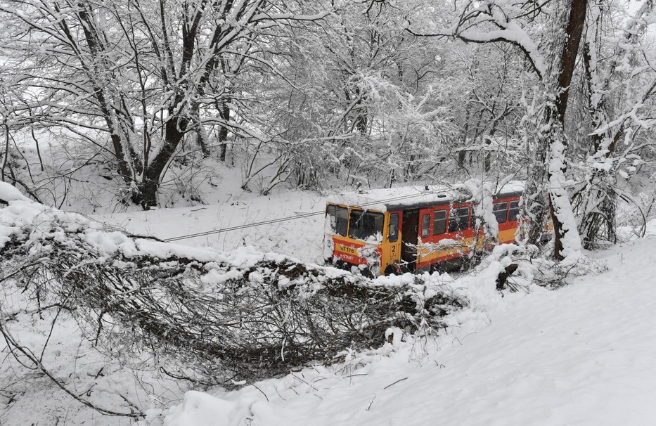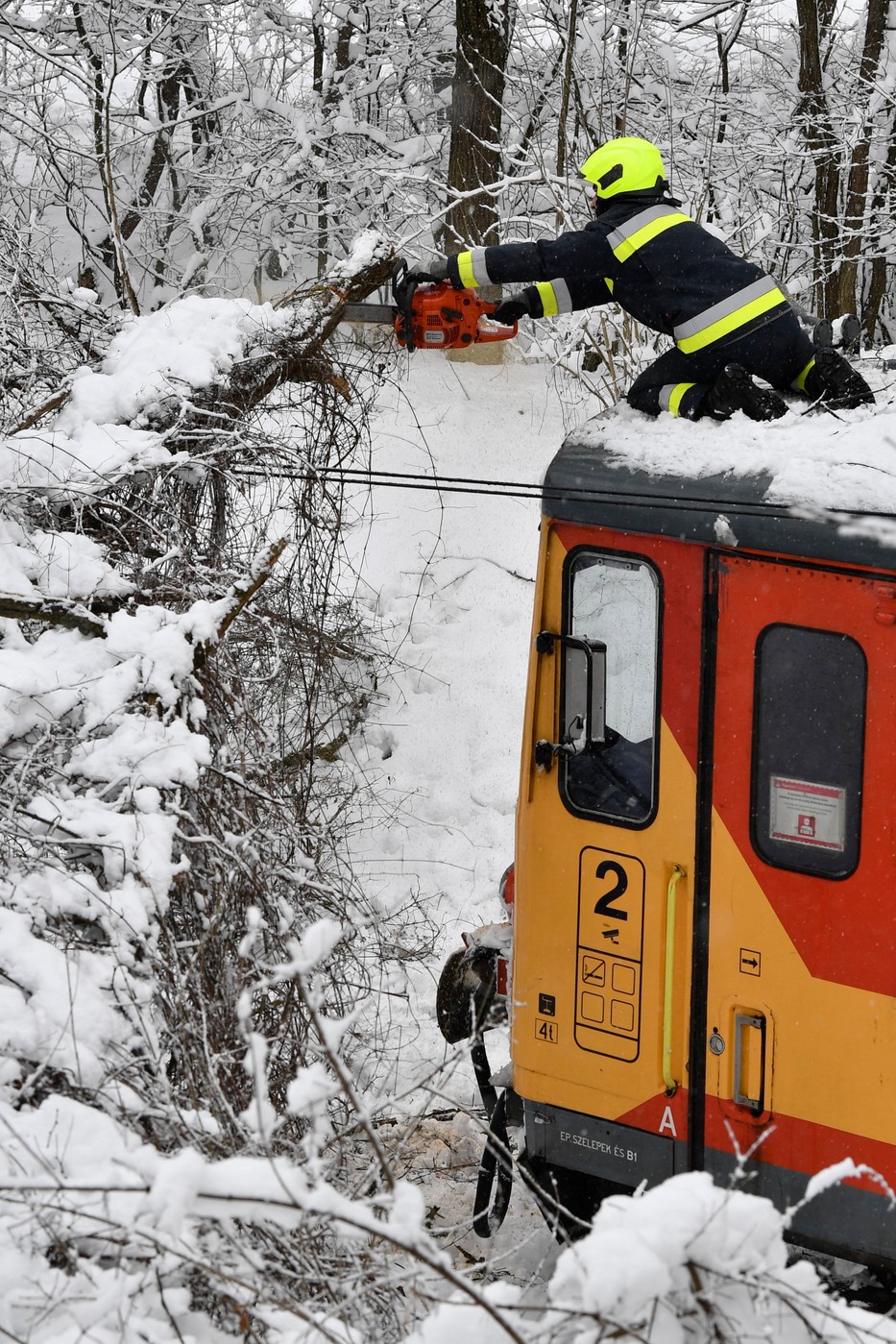 Szilvásvárad közelében a hó súlyától félig kidőlt fa akadályozza a vasúti közlekedést, egy tűzoltóautó pedig az árokba csúzott. Az MTI fotókat adott ki a helyszínről.