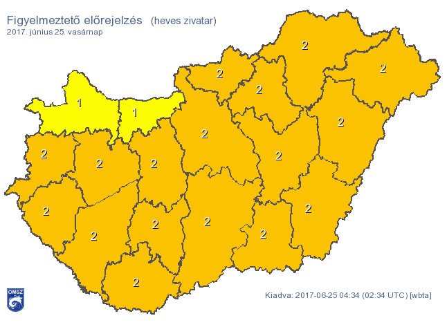 A délelőtti órákig általában az ország délkeleti részének kivételével több helyen várható zivatarok kialakulása. A kelet felé áthelyeződő zivatarokat felhőszakadás (20-50 mm, főként a Dunántúlon néhol 50-60 mm-t jelentősen meghaladó csapadék), jégeső, viharos (60, néhol 80 km/h-t meghaladó szél) kísérhet.