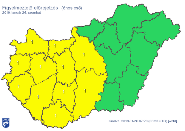 Szombaton a déli óráktól északnyugat felől az éjféli órákig egyre többfelé fordulhat elő kisebb csapadék az országban, amely kezdetben szilárd, majd elsősorban az esti és éjféli órák között a hó mellett vegyes halmazállapotú (fagyotteső, ónos eső, havaseső, eső) csapadék formájában várható a Dunántúlon és a Duna-Tisza köze nyugati részén. A Dunántúl északi felében valószínűbb a több vegyes halmazállapotú csapadék. A délkeleti, keleti határ közelében szombat délig havazás előfordulhat (lepel-1 cm).