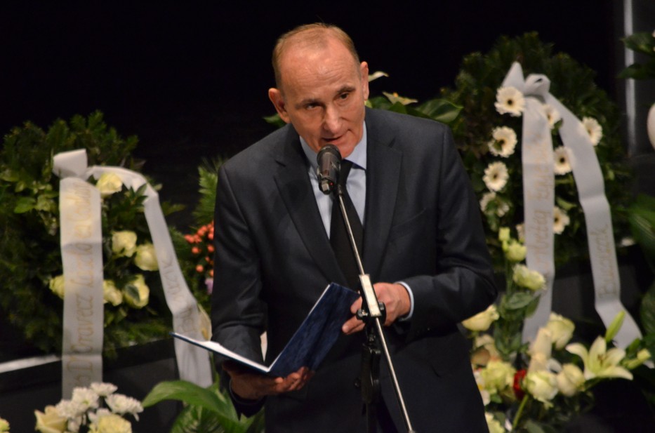 A szertartáson a polgármester beszédet is mondott: „Fekete pohárban sárga kankalin, sokasodnak a halottjaink…” Kányádi Sándor versével búcsúztam nemrég Szűcs Lajostól, most ugyanezt teszem. Nem csak a rendkívül tehetsége színésznőre, hanem a gödöllői Pécsi Ildikóra szeretnék emlékezni, aki még tavaly is részt vett az általa alapított Erzsébet királynő szavalóversenyen. Bár a legnagyobb magyar művészekkel játszhatott együtt, mégsem okozott neki gondot, hogy itt ebben a teremben velünk, amatőr színészekkel is ezt tegye. Magam is részese lehettem néhány darabnak. Ildikót megismerhettem, mint embert, aki mindig és mindenütt segíteni akar, aki odaér az emberek szívéhez, lelkéhez. Emlékszem, egyszer arra kértem, hogy a gödöllői idősek otthonában lépjen fel, csak annyit kérdezett: hányra érjek oda? Amikor megérkezett, kért egy kávét és tíz percet, majd fél órán át nevettette az idős lakókat. Több mint ötven éves gyönyörű együttléte párjával, idén nyáron ért véget, de most újra együtt vannak…