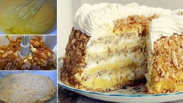 A lapra kenünk egy réteg tojássárgájás krémet, majd egy réteg karamell krémet és egy másik lapot teszünk rá, egészen addig amíg a lapok el nem fogynak. A tetejét megkenjük krémmel, megszórjuk dióval és tejszínhabbal díszítjük.