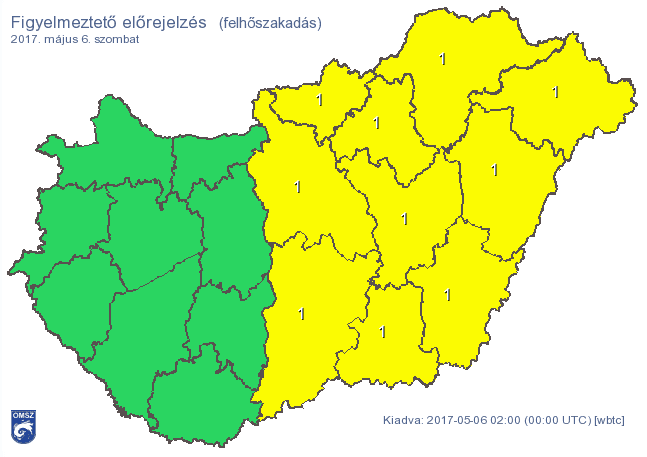 Elsőfokú, citromsárga riasztás van érvényben felhőszakadások veszélye miatt, az érintett területeken rövid idő alatt akár 20 milliméternél is több eső eshet.