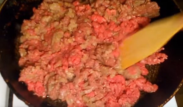 Szeleteljük fel a húst és a megtisztított hagymát apró darabokra majd daráljuk le. Tisztítsuk meg a burgonyát, szeleteljük fel és főzzük meg sós vízben. A húst és a hagymát fűszerezzük, adjuk hozzá a zúzott fokhagymát, majd egy serpenyőben pirítsuk meg.