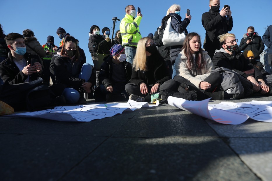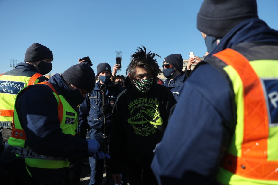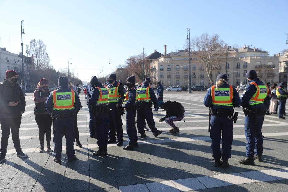 Az eredetileg körülbelül 200 fős csoportosulás az igazoltatások után nagyjából megfeleződött. A tüntetésen a tervek szerint vendéglátósok és egyéb, a korlátozások által érintett dolgozók megjelenését és felszólalását várják. Közben folyamatosa igazoltatnak a rendőrök mindenkit, egyelőre, 13 óra után pár perccel még nem volt felszólaló, illetve egy valaki mondta el, hogy egy éve nincs munkája, pedig a vendéglátózásra tette fel az életét, de egy év alatt alig valamennyi munkája volt, az is csak raktári munka. A nevét nem árulta el, rövid mondanivalója végén a rendőrök igazoltatták őt is. Néhányan ezek után szintén mondtak néhány mondatot az összegyűltekhez szólva, elégedetlenségüknek adva hangot. Nagyjából 20 fiatal leült a tér közepén, ezzel tiltakoztak a rendőri igazoltatás ellen.