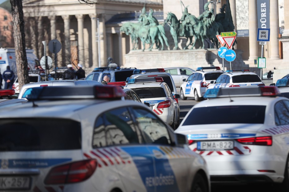Egy óra után még mindig körülbelül 200 fős tömeg van a Hősök terén, egy komolyabb rendőri sorfal gyülekezik a tér Műcsarnok felőli oldalán.