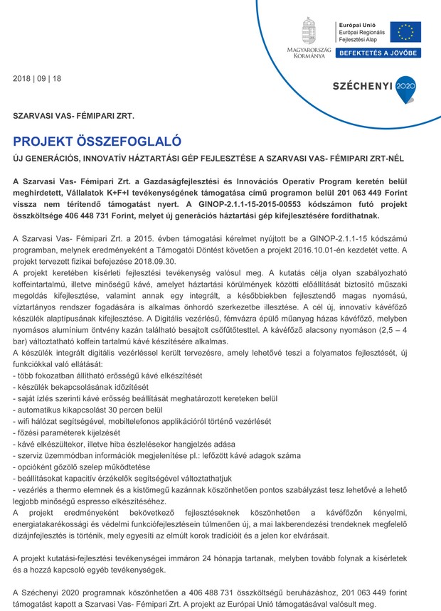 „A Szarvasi Vas- és Fémipari Zrt. kutatás-fejlesztési projektjét 2018. szeptember 30-án lezárta. A kutatás-fejlesztési célkitűzéseink maradéktalanul teljesültek, amelynek keretében egy teljesen új technikai elven működő, de máshol már alkalmazott műszaki megoldást és gyártási technológiát adaptáltunk a Szarvasi Vas- és Fémipari Zrt .kávéfőző berendezésében. A fejlesztési folyamatok keretében a kávéfőző készülék összes részegységét újraterveztük, így egy versenyképes és a kor igényeinek megfelelő, modern háztartási gépet tudunk piacra vinni.