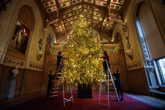 Erzsébet királynő Windsori kastélyába már beköltözött a karácsony, a személyzet éjt nappallá téve dolgozott, hogy feldíszítsék a hat méteres Nordmann-fenyőt, ami a palota Szent György termébe is alig fért be.