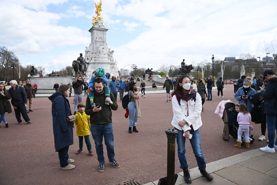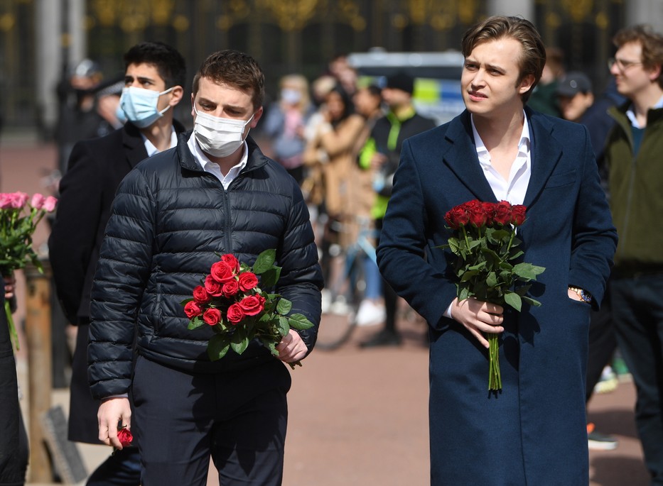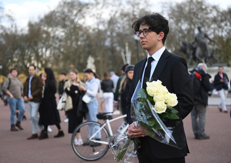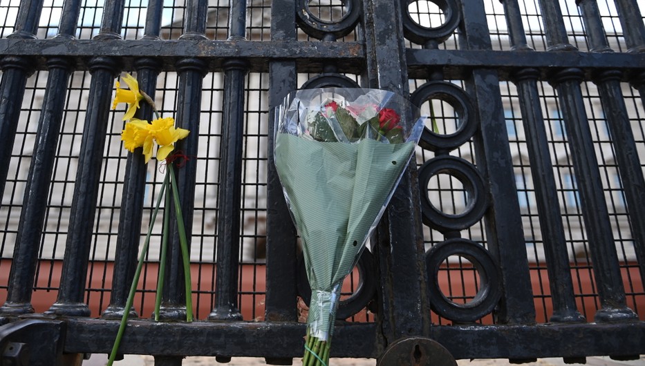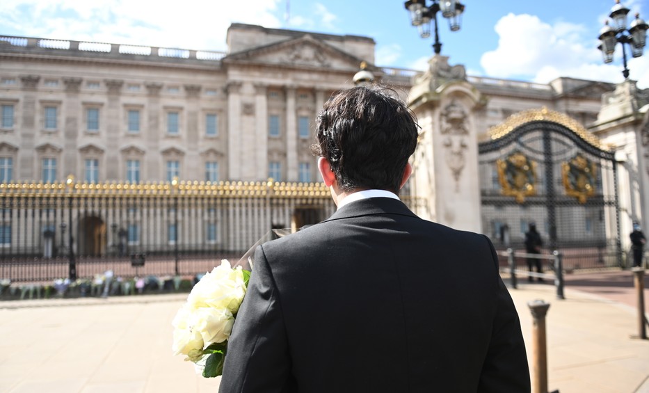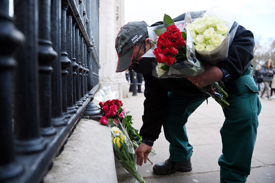 Az emberek a Buckingham-palotánál virágokat és üzeneteket hagynak a kerítésnél, gyászol az ország.