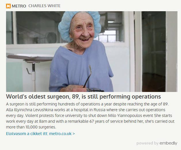 Alla Illyinichna Levushkina a világ legidősebb praktizáló sebésze. A Metro cikke szerint a nő most 89 éves, egy orosz kórházban dolgozik, ahol napi szinten végez műtéteket.
