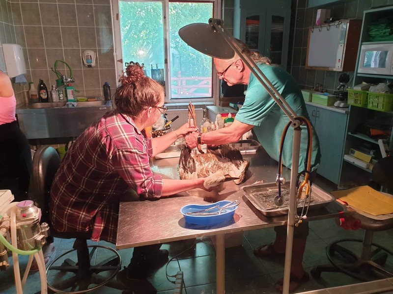 A földre esett gólyának szárnyai törtek, a vezetéken lógó madár is élt, ezért elkezdtek tárgyalni a szolgáltatóval. – A leesett gólyát egy dobozba raktuk Bálinttal, aki hősiesen segítette a mentést nagypapájával. Mivel a szolgáltatóval zajlott a tárgyalás a lógó állatról, így neki akkor még nem tudtunk segíteni. Bálint hősiesen vigyázta a másikat, akit csak éjjel, fél 12 körül tudtak leemelni a vezetékekről. Ezért a madármentő csak másnap reggel tudta őt is kórházba szállítani. –Őt szerencsére nem kellett megműteni, főként zúzódása lett. Most mindketten a madárkórház gólyakertjében gyógyulgatnak.