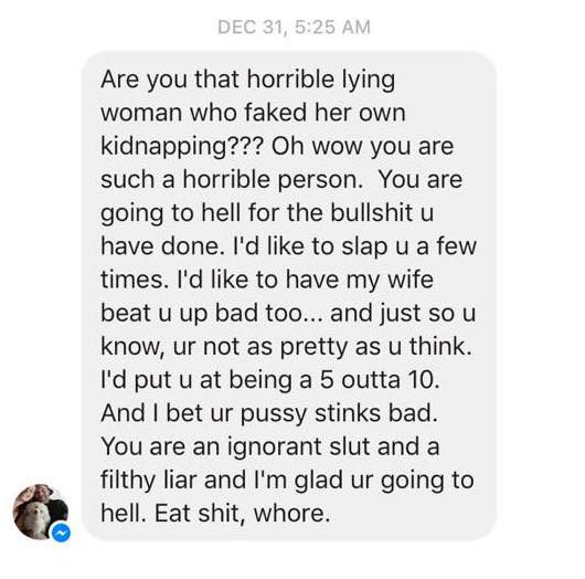 „Te vagy az a borzalmas, hazug nő, aki eljátszotta, hogy elrabolták? Borzalmas ember vagy. A pokolra fogsz kerülni azért, amit tettél. Legszívesebben jól felpofoználak néhányszor. De a feleségem is szívesen elverne… Ja és csak hogy tudd, nem vagy olyan szép, mint amilyennek gondolod magad. Maximum egy 5-ös vagy egy 10-es skálán. És biztos vagyok benne, hogy a p***d is büdös. Egy ostoba ribanc vagy, egy mocskos hazudozó, és örülök, hogy a pokolra kerülsz. Egyél szart, te k***a.”