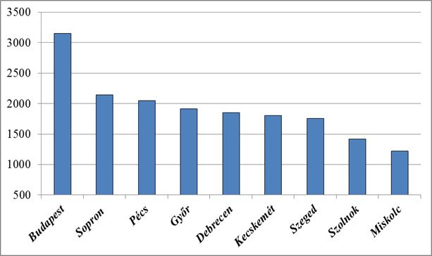 Átlagos albérletárak egyes egyetemi nagyvárosokban (Ft/m2)