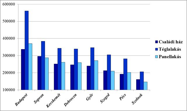 A főváros továbbra is listavezető, ennek árszínvonalától a soproni ingatlanok 12-31%-kal elmaradnak. A vidéki városok mezőnyéből kitűnnek a Kecskeméten, Debrecenben és Győrben meghirdetett házak és lakások, előbbi típus 240-250 ezer Ft/m2, a panelek 260-270 ezer Ft/m2, a téglaépítésűek pedig 338-346 ezer Ft/m2 átlagos árakon vásárolhatók meg. Közepes árkategóriába tartoznak a Pécsen és Szegeden eladó családi házak 190-213 ezer Ft/m2, a panellakások 200-210 ezer Ft/m2, a téglaépítésű társaik pedig 282-305 ezer Ft/m2 átlagárakkal. Ehhez képest Szolnokon mintegy 16-32%-kal kedvezőbb átlagos négyzetméterenkénti árakra számíthatnak az érdeklődők.