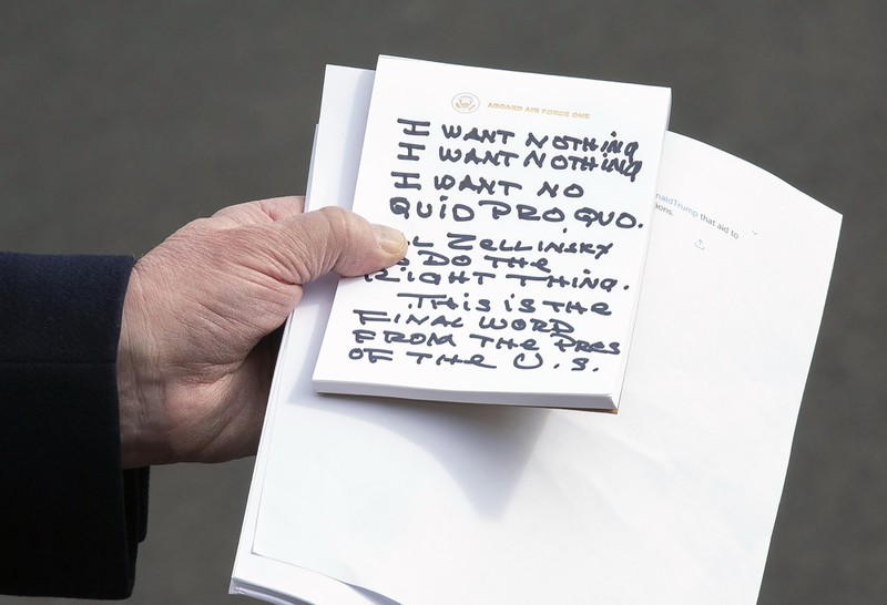 „Semmit sem akarok, semmit sem akarok, semmit. Megteszem, amit tenni kell a Zelenszkijjel kapcsolatos kérdésekben. Ez minden, amit jelenleg mondani akarok” – ez a meglehetősen egyszerű pár mondat szerepel a jegyzetekben, ráadásul óriási betűkkel, így az is látszik, hogy az ukrán elnök nevét (angolul Zelensky) hibásan írta le.