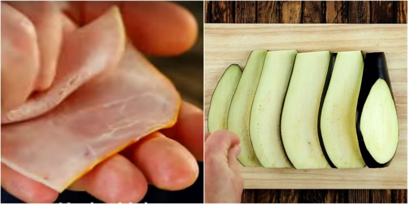 Egy hosszúkás sütőformát kikenünk vajjal és a tészta egyharmadát beletesszük. A padlizsán felét rárakjuk, a sonkaszeleteket feltekerjük és a felét rátesszük. Erre egy újabb adag tészta, padlizsán és sonka következik, a felső réteg tészta legyen.