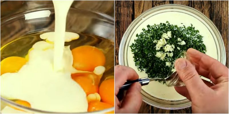 A tojásokat a tejszínnel felverjük, hozzáadjuk a fűszereket, a zúzott fokhagymát és a felaprított petrezselyemzöldet.