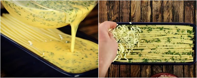 A szószt ráöntjük a tésztára és megszórjuk a reszelt sajttal. 180 fokos sütőben 40 percig sütjük.